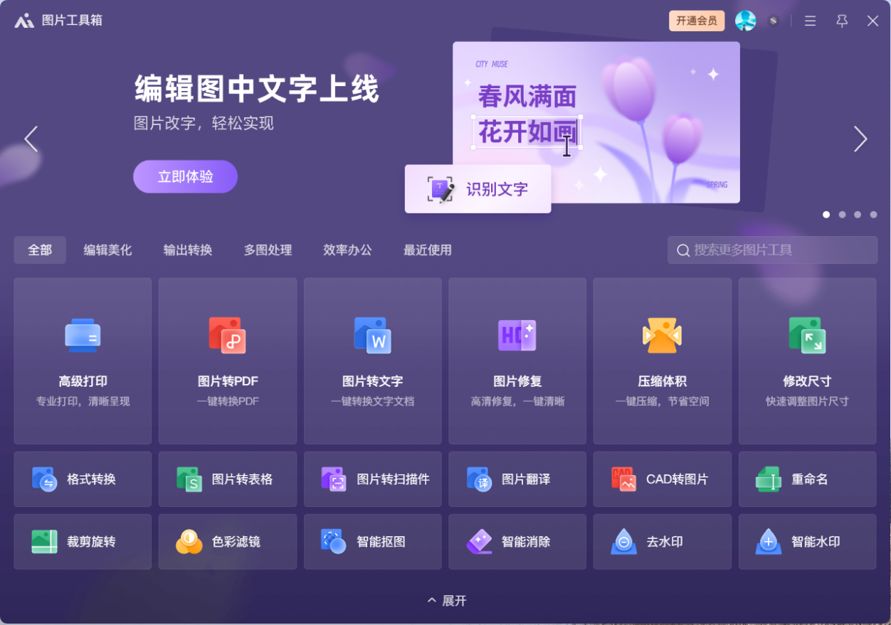 ◎图片工具箱:电脑中的图片文件可以使用“WPS图片”打开,支持图片高级编辑、智能格式转换、图片专项处理等能力。